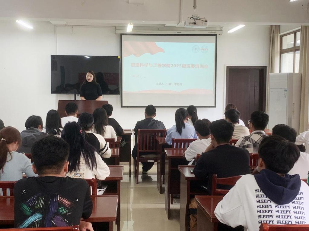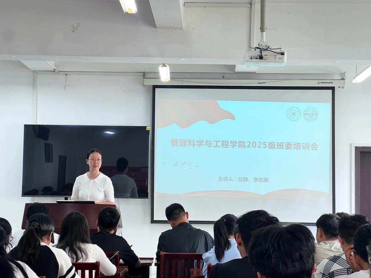 在汇文楼A308教室组织召开2025级新生班委培训会。培训由辅导员任静、李思雨主讲,全体新生班长、副班长、团支书及学习委员参加。