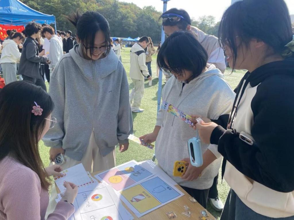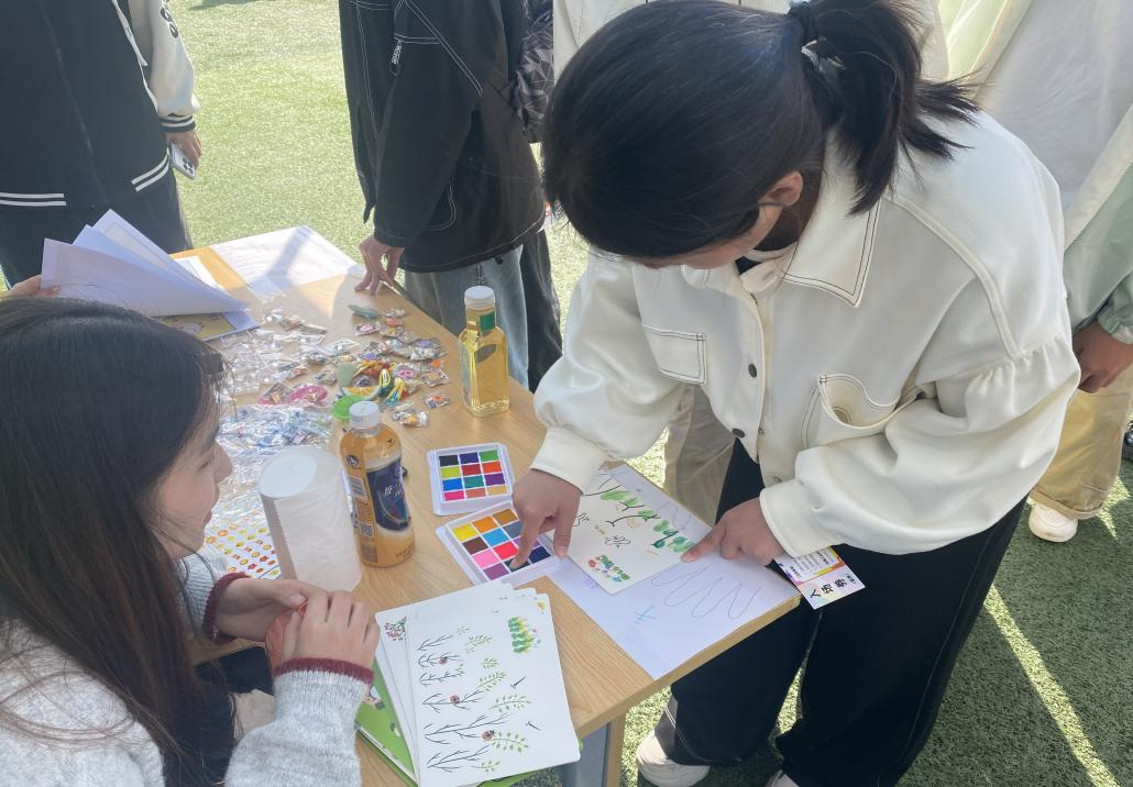 学院精心设计了五项主题活动:“logo大作战”“情绪小卖部”“手指画”“emoji谐音梗猜词”与“气球对抗赛”。“logo大作战”通过变动常见标识设置障碍,考验学生的观察与辨识能力;“情绪小卖部”分设“小确幸”与“小烦恼”收集箱,鼓励学生在书写与投递中传递温暖、疗愈心灵;手指画活动中,同学们以指尖为笔,在轮廓中创作个性图案,在轻松创作中舒缓焦虑、享受宁静。“emoji谐音梗猜词”环节气氛热烈,同学们或凝神思考,或为破解谜底欢呼雀跃,在谐音妙趣中激发思维火花、拉近彼此距离。“气球对抗赛”则将现场氛围推向高潮。两人一组协作,一人蒙眼行动、一人言语指挥,在气球爆破的清脆声响中见证默契、释放压力。
