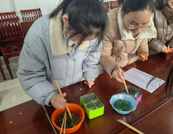 本次活动精心设置了掷飞镖、跳绳、夹弹子、踢毽子、筷子入瓶五大趣味项目,既兼顾运动的竞技性与趣味性,又注重参与的广泛性。平日里深耕讲台、伏案钻研的老师们纷纷变身赛场“达人”,现场瞬间成为欢乐的海洋。掷飞镖项目中,选手们屏息凝神、精准瞄准,一道道优美弧线勾勒出专注与从容;跳绳场上,轻盈的步伐伴随着欢快节奏,展现着教职工们蓬勃的生命力;夹弹子与筷子入瓶项目则考验着大家的耐心与细致,指尖的灵巧操作引来阵阵喝彩;踢毽子区域更是热闹非凡,彩色毽子在脚尖轻盈翻飞,时而高抛时而回旋,尽显功底与技巧。